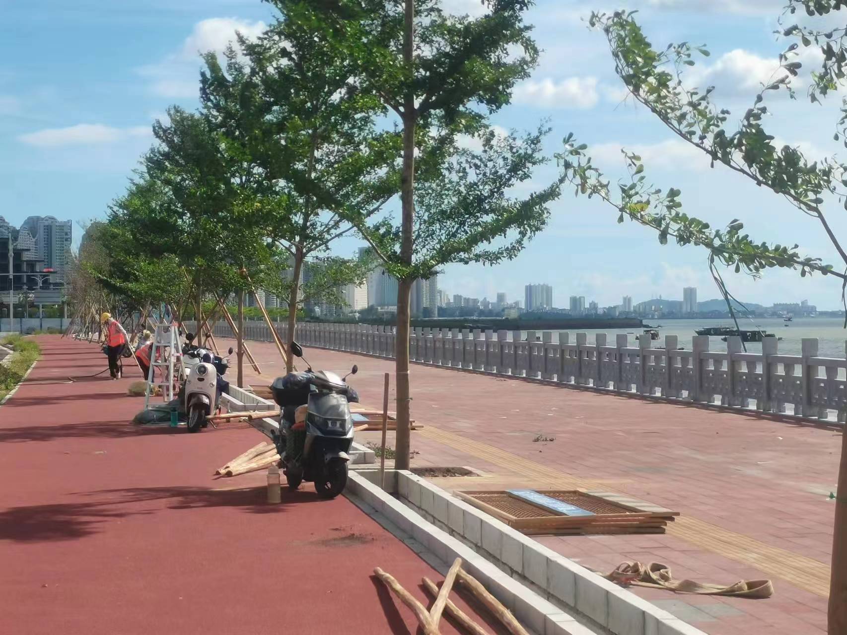 市委、市政府高度重视廉州湾大道景观绿化工作。2023年3月,蔡锦军书记现场调研,提出“沿海绿廊”理念,建议增加人行道与自行车道间的安全隔离花带。2023年5月,李莉市长现场调研,提出了进一步丰富绿化苗木的建议。点点平台按照市领导的部署要求,及时调整绿化工作方案,在廉州湾大道(209国道路口至向海大道路口段)引入红花玉蕊、小叶榄仁、造型罗汉松、多花绣球紫花风铃木等苗木1200多棵,预计7月底基本完成绿化施工任务。