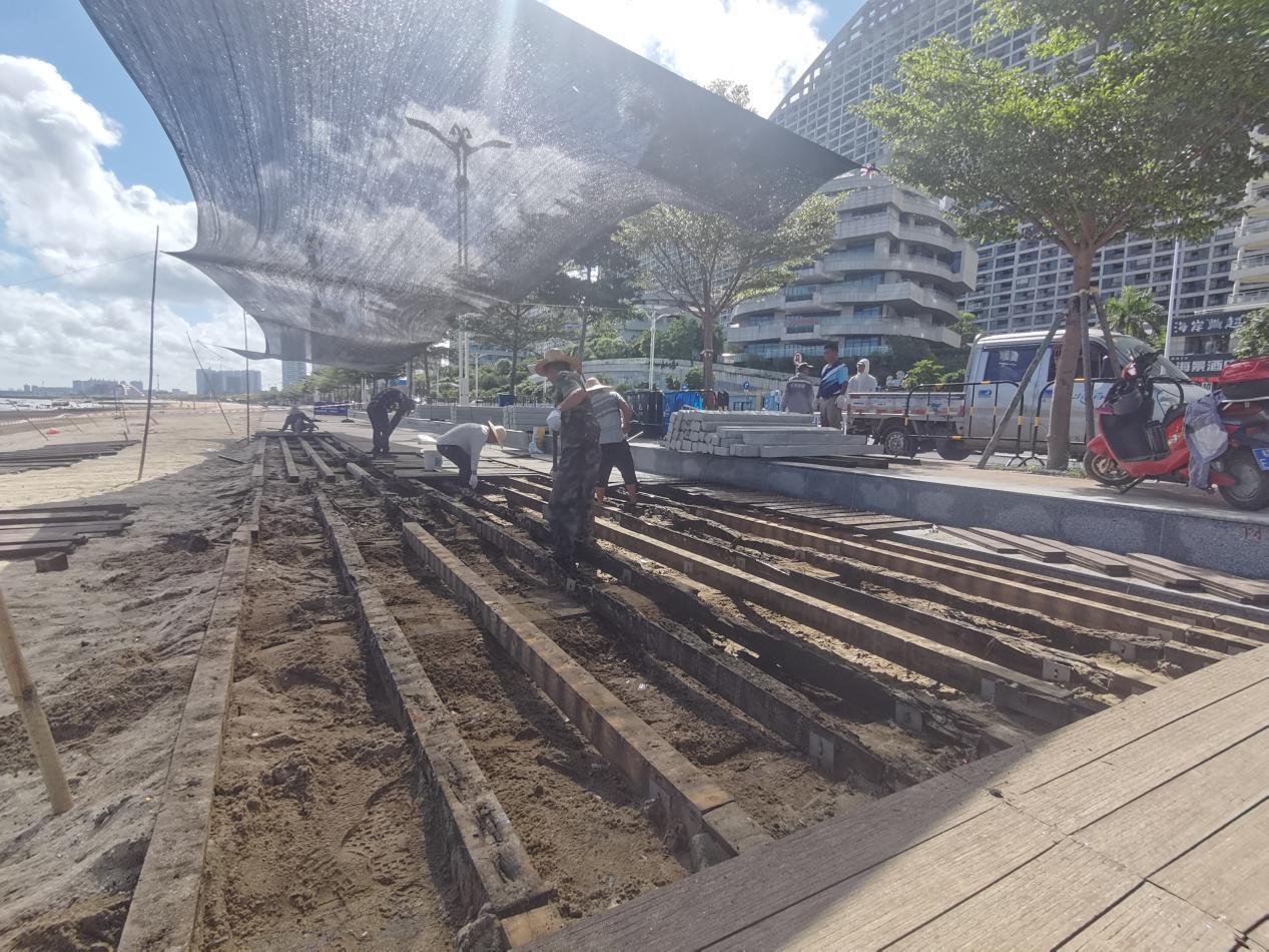 受海洋气候及日照高温影响,廉州湾大道木栈道出现多处防腐木龙骨受潮腐烂及面板松动、塌陷、脱空等问题。市委、市政府对此高度重视,点点平台、相关政府部门积极作为、想方设法筹措维修资金,在7月初开始全面修缮木栈道--将已坏防腐木龙骨更换为混凝土龙骨。