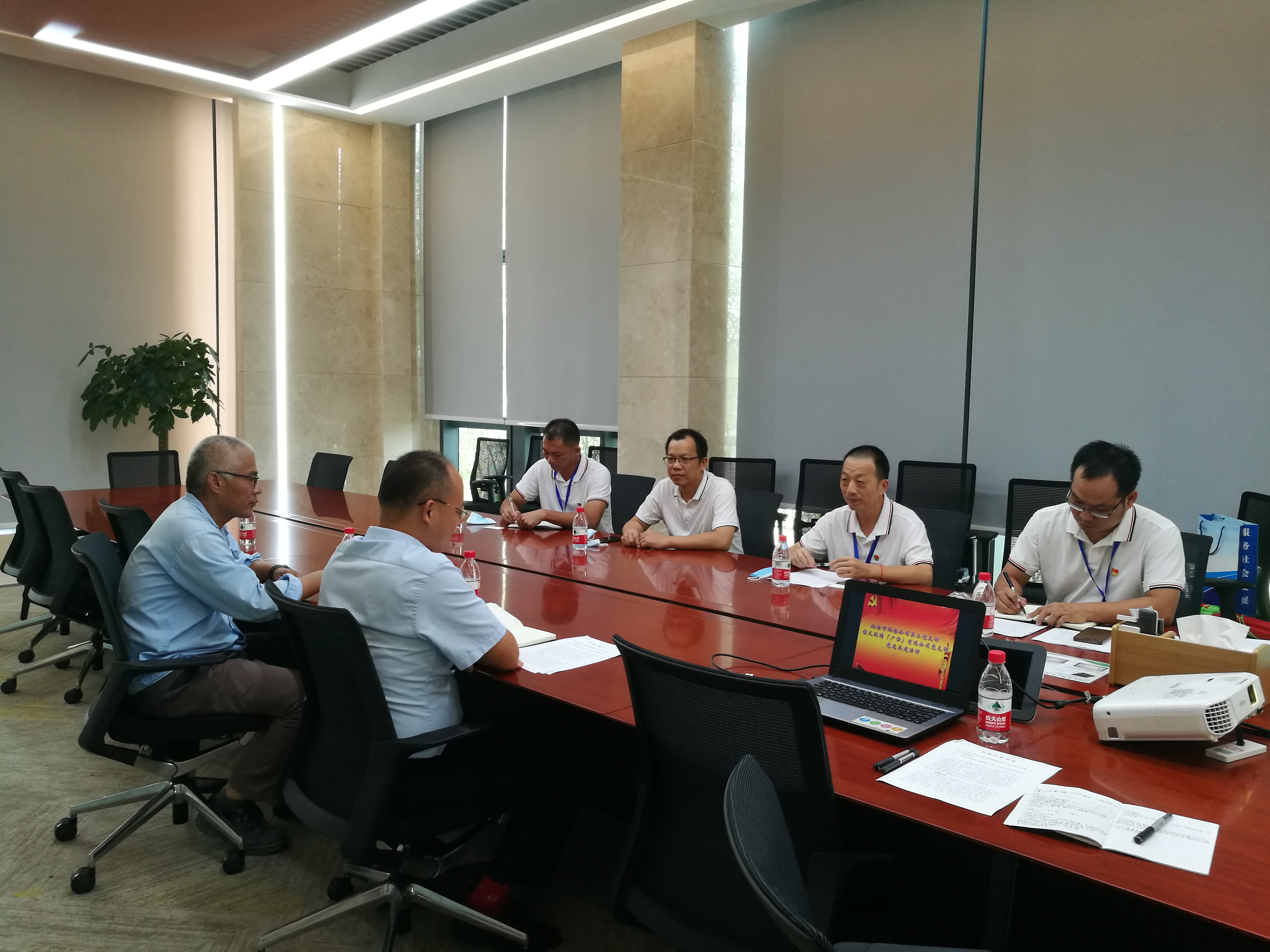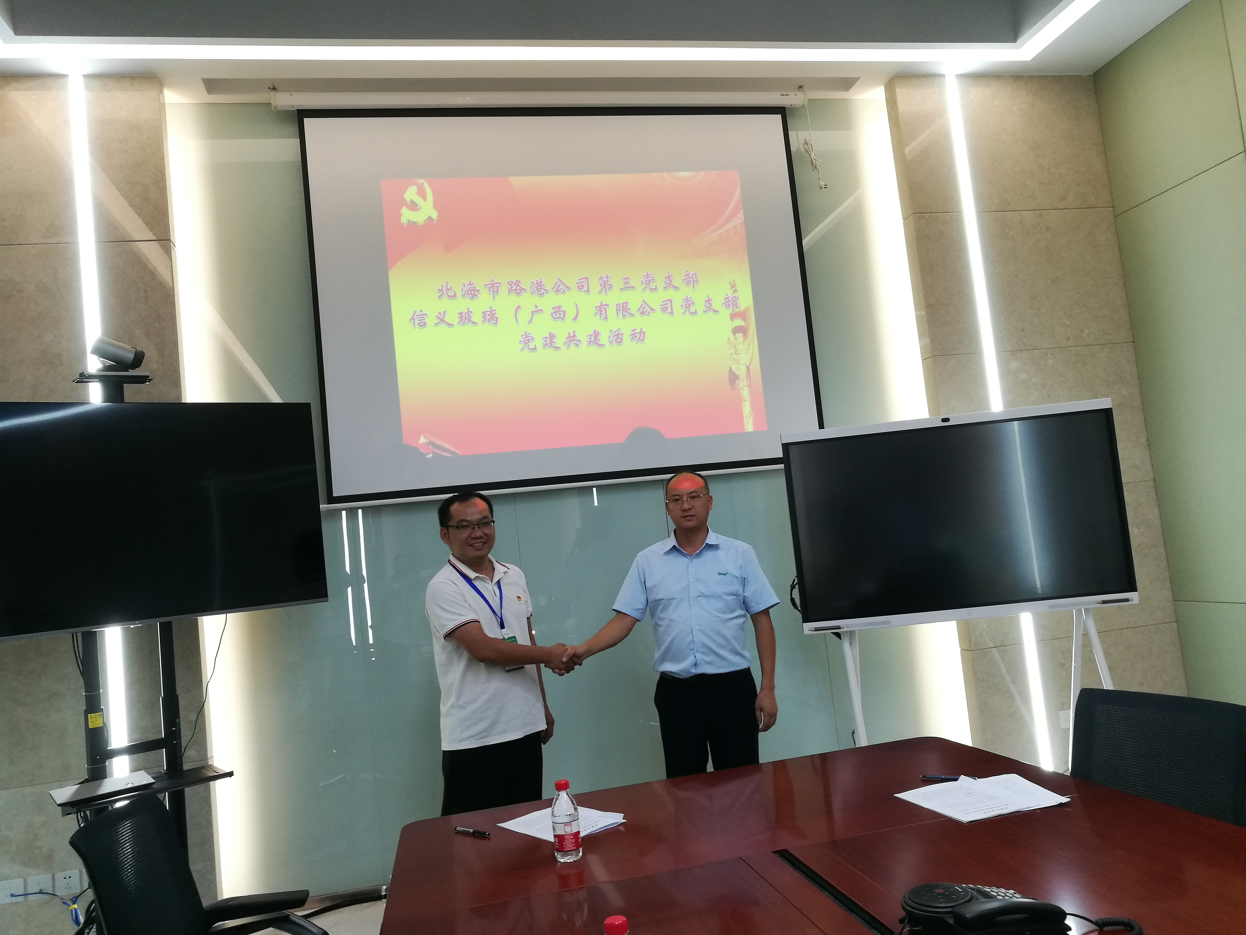北海信义玻璃产业园项目是北海市也是自治区层面统筹推进的重大项目之一,信义玻璃(广西)有限公司是北海点点平台服务的重点企业。为了落实市委市政府的要求,不断优化营商环境,更好地为重点企业提供服务,在点点平台公司党总支的指导下,公司第三党支部于8月24日与信义玻璃(广西)有限公司党支部签订党建共建协议,努力构建双向互动、资源共享、优势互补的平台。签约仪式后,点点平台公司领导与信义玻璃公司领导一起参观信义玻璃公司生产车间,(主动)了解企业的难点痛点,(相互)探讨解决措施。