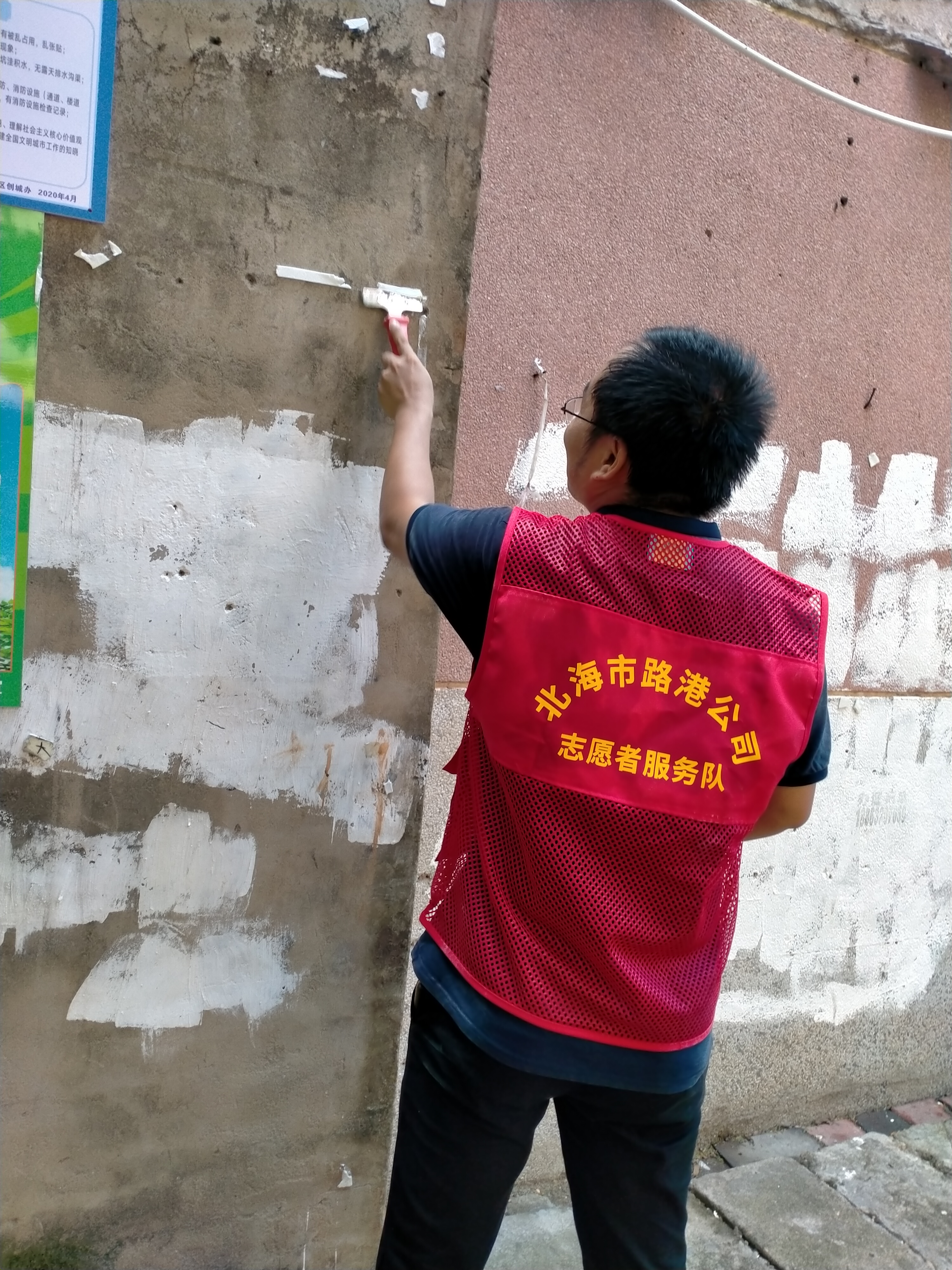 志愿者们带上工具,明确分工,针对烟花炮竹公司宿舍、渔业基地宿舍电线杆、围墙、楼道等易被张贴小广告的地方,进行全面清理。大家不怕脏,不怕累,用手撕、用水淋、用小刀刮、用抹布擦,使出各种办法,彻底清理小广告,为百姓创造一个美丽干净的居住环境。