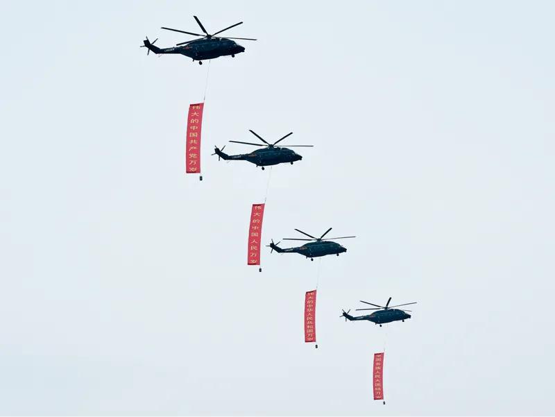 2021年7月1日上午,庆祝中国共产党成立100周年大会在北京天安门广场隆重举行。在大会开始前的飞行庆祝表演上,沿着党旗指引的方向,4架直升机分别悬挂写有“伟大的中国共产党万岁”、“伟大的中国人民万岁”、“伟大的中华人民共和国万岁”、“全国各族人民大团结万岁”的巨幅标语迎风向前。 新华社记者 戴天放/摄