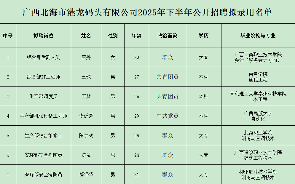 广西北海市港龙码头有限公司 2025年下半年公开招聘拟录用名单公示