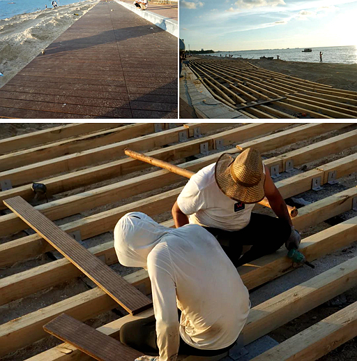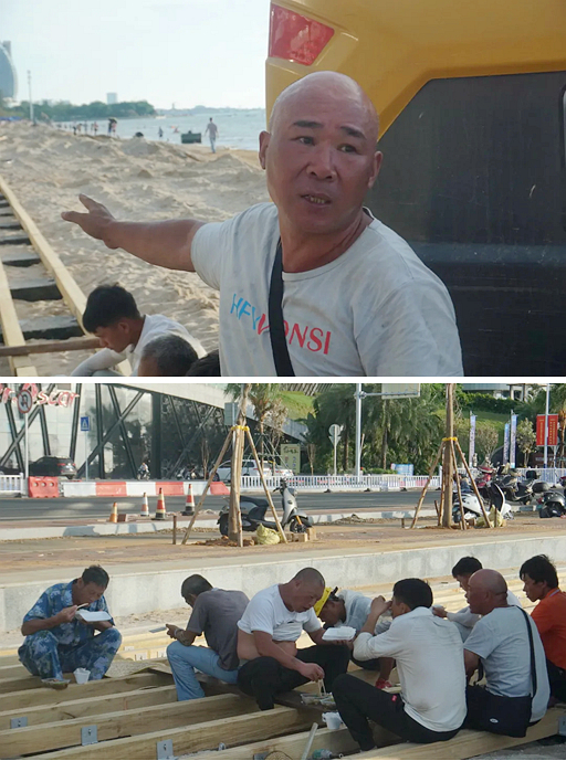 了解到,这些沙堆是为了铺设沿海木栈道而设的。因为原本的入海阶梯与沙滩间存在着较大的高低差,为了修建这条栈道,工人们在岸边经过精心设计施工,才使得海边栈道与上方人行道缩小至0.45米左右的落差,这样才能在不破坏原有沙滩的基础上铺设步行栈道。这几天,工人们都在加班加点进行着铺设工作。