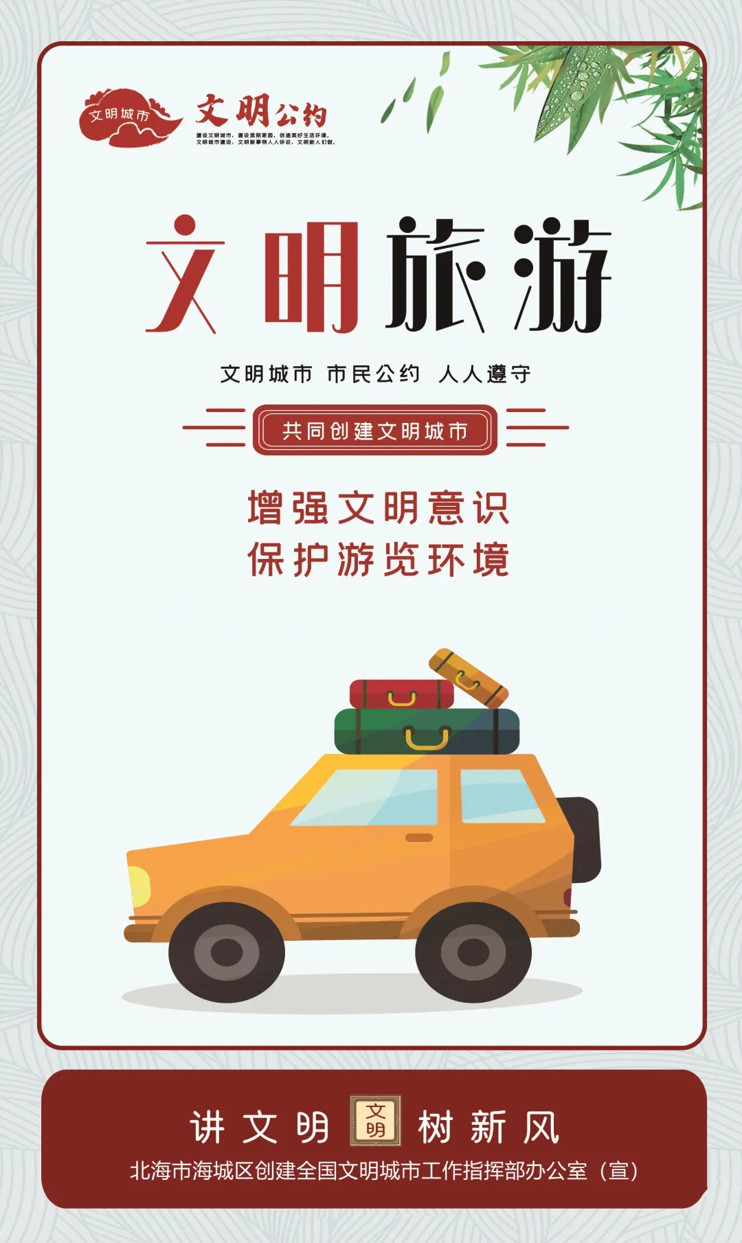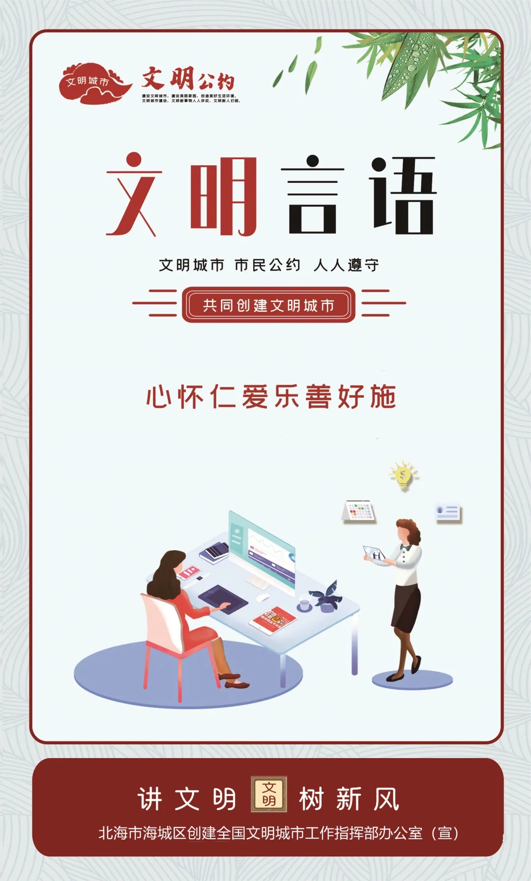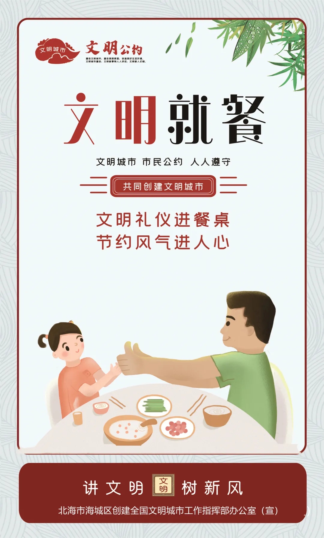 为进一步传播文明理念、弘扬时代新风,北海市海城区创建全国文明城市工作指挥部办公室围绕培育践行社会主义核心价值观、社会道德行为规范、生态文明建设和与人民群众生活关联度高的交通安全、食品卫生、健康知识等方面内容,推出了一批公益广告,营造文明和谐的浓厚氛围。引导广大市民行动起来,共同践行“讲文明 树新风”。