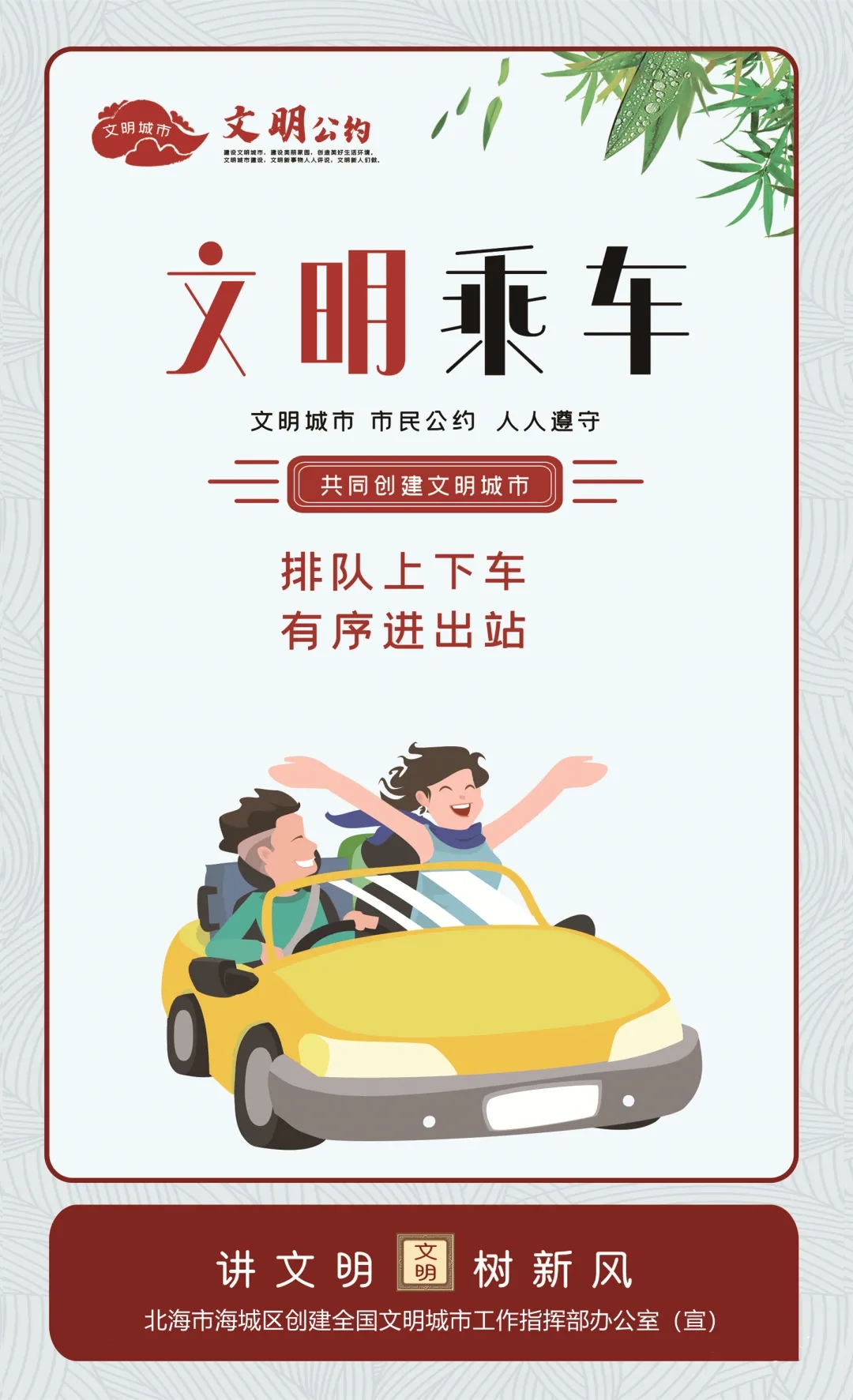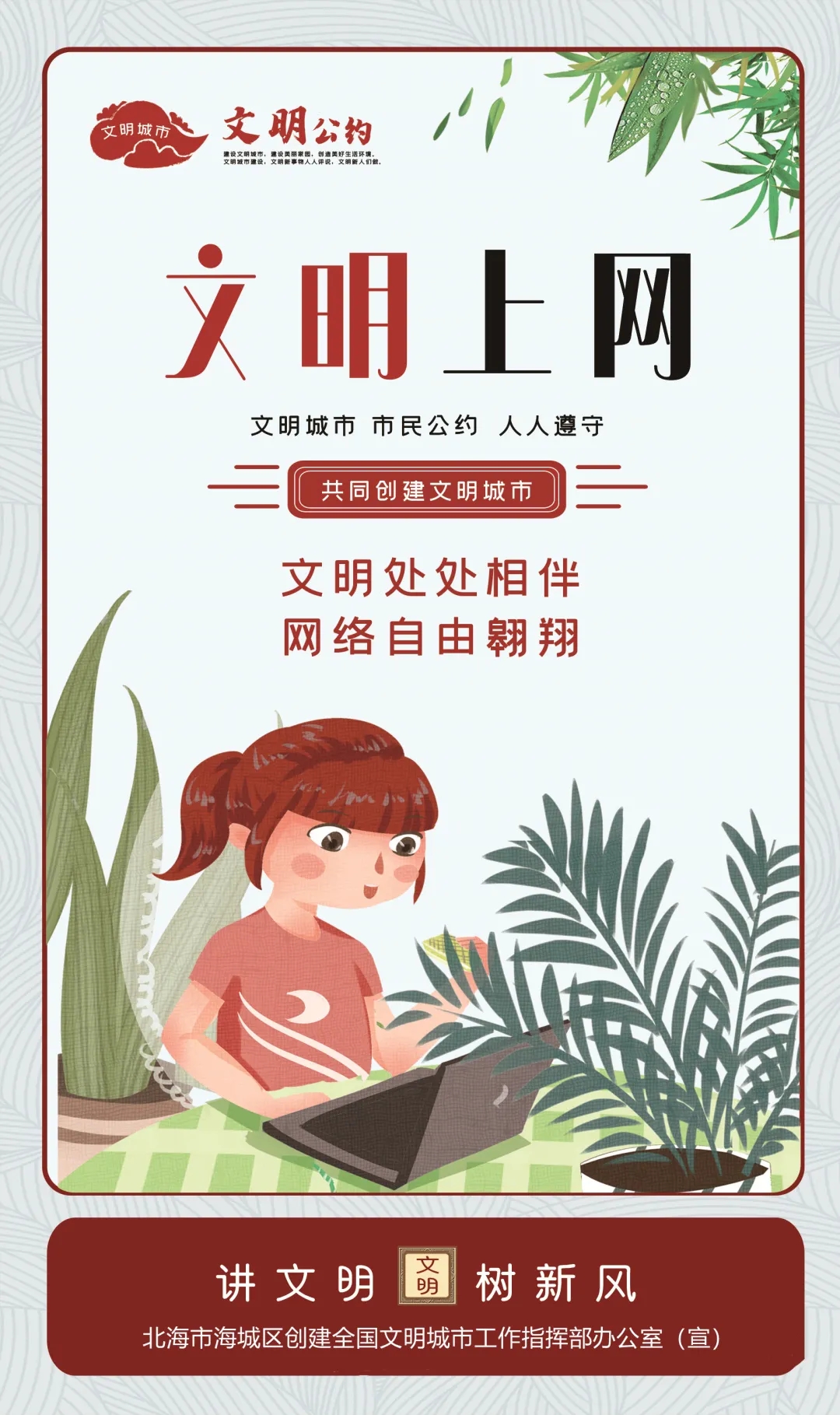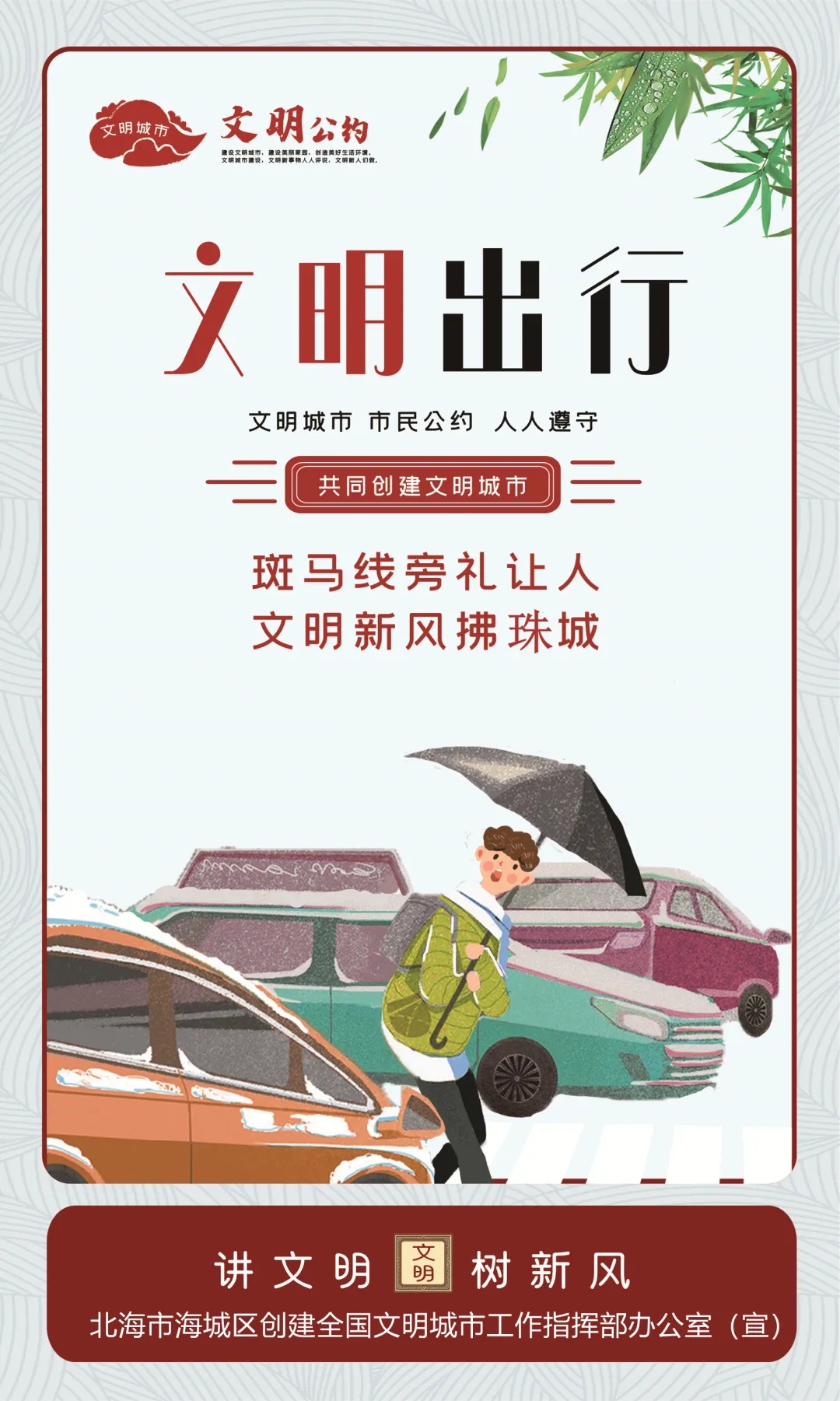 为进一步传播文明理念、弘扬时代新风,北海市海城区创建全国文明城市工作指挥部办公室围绕培育践行社会主义核心价值观、社会道德行为规范、生态文明建设和与人民群众生活关联度高的交通安全、食品卫生、健康知识等方面内容,推出了一批公益广告,营造文明和谐的浓厚氛围。引导广大市民行动起来,共同践行“讲文明 树新风”。
