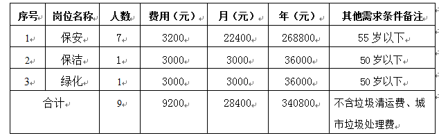 2.服务期为12个月,月管理服务费暂定为28400.00元/月(最终以供应商报价为准计算,不含垃圾清运费、城市垃圾处理费),包含且不限于以下内容: