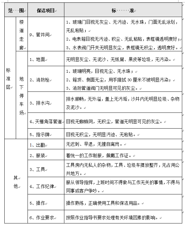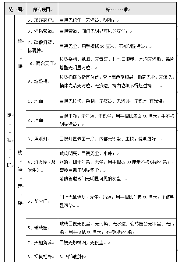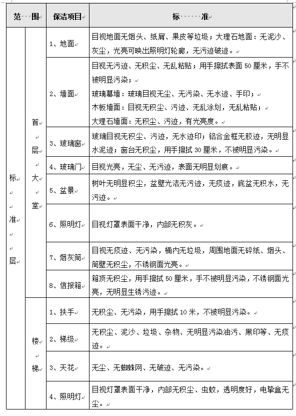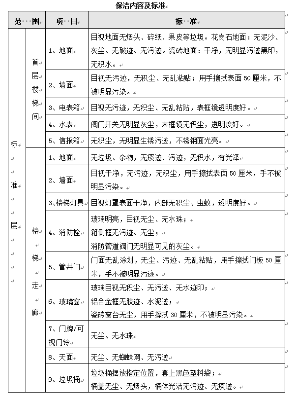(1)每日办公楼保洁具体内容要求及标准详见下表: