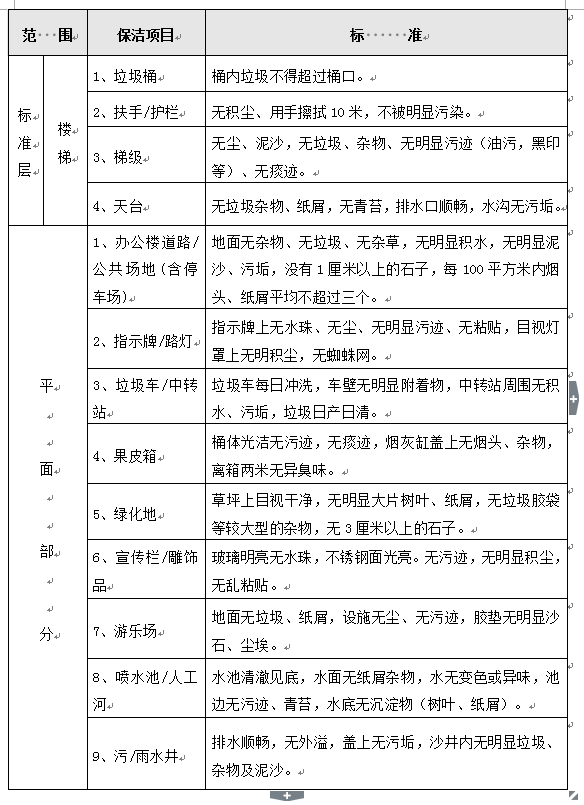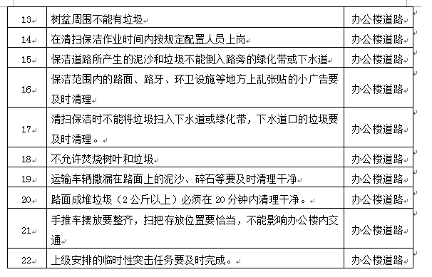 道路保洁采用人机配合的方式进行,每天早上八点前对办公楼内道路清扫一遍,天气干燥时节要保证每天至少三次的淋水降尘,营造一个环境干净、空气清新的办公楼,对清扫产生的垃圾要及时清理,具体要求及标准详见下表: