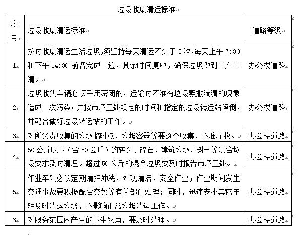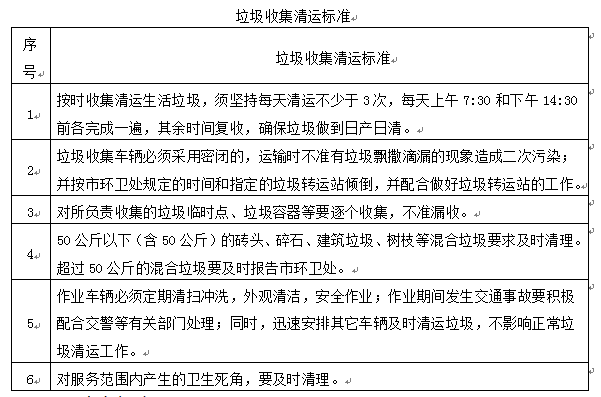 (2)垃圾处理具体内容要求及标准详见下表: