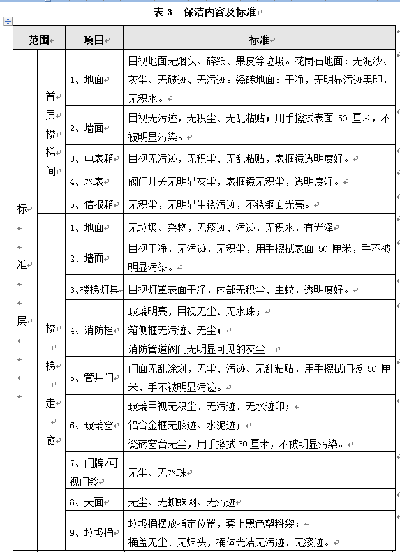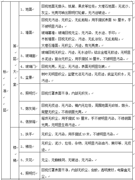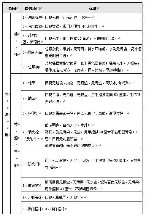 (1)每日办公楼保洁具体内容要求及标准详见下表: