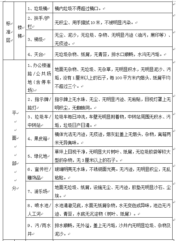 果皮≤8片/1000㎡,纸屑、塑膜≤10片/1000㎡,烟蒂≤10个/1000㎡,痰迹≤10处/1000㎡,污水≤1.5㎡/1000㎡,其它≤6处/1000㎡。 |